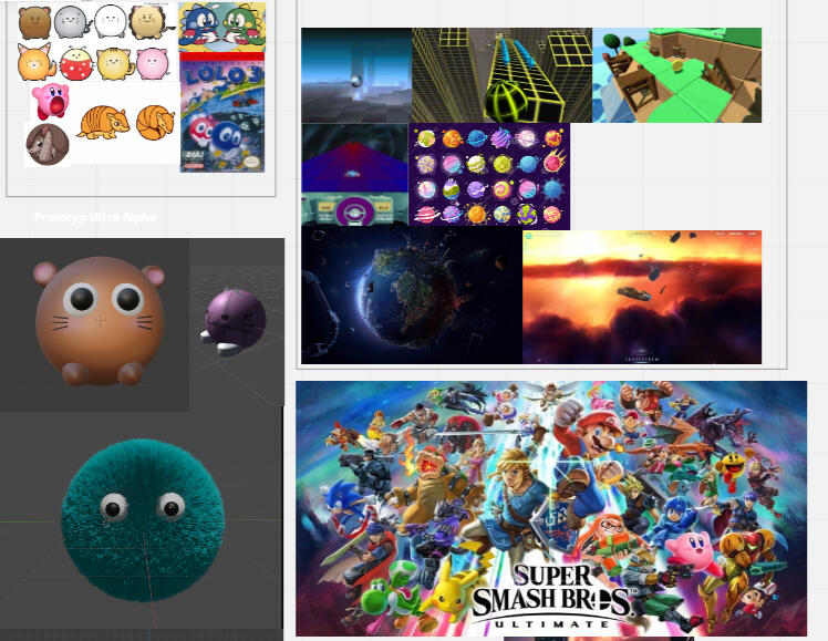 We started the project by brainstorming in Miro. We were given some directions but it was our choice to decide what kind of game we wanted to create. We started off with a miro board to get as many ideas as possible. We pretty soon got inspiration from different games and environments. After this, we got stuck and did not know what to do with all the inspiration pictures we had gathered since we did not have a game idea.We got a hint from a teacher that we should start to look after mechanics that we found funny and could make the game unique. I found a game called Loco Roco that my friends and I played on PSP when we were younger. Loco Roco had a fun feature where you had to change in size by picking up fruits to make it through the obstacles.We also decided to make it a runner game since we were introduced to a game called Skyroads. This was where our idea started to grow. Afterward, we decided to make a space Olympics for the characters. We wanted to have rolling animal characters on the course, and took some inspiration from the character ''Kirby''.